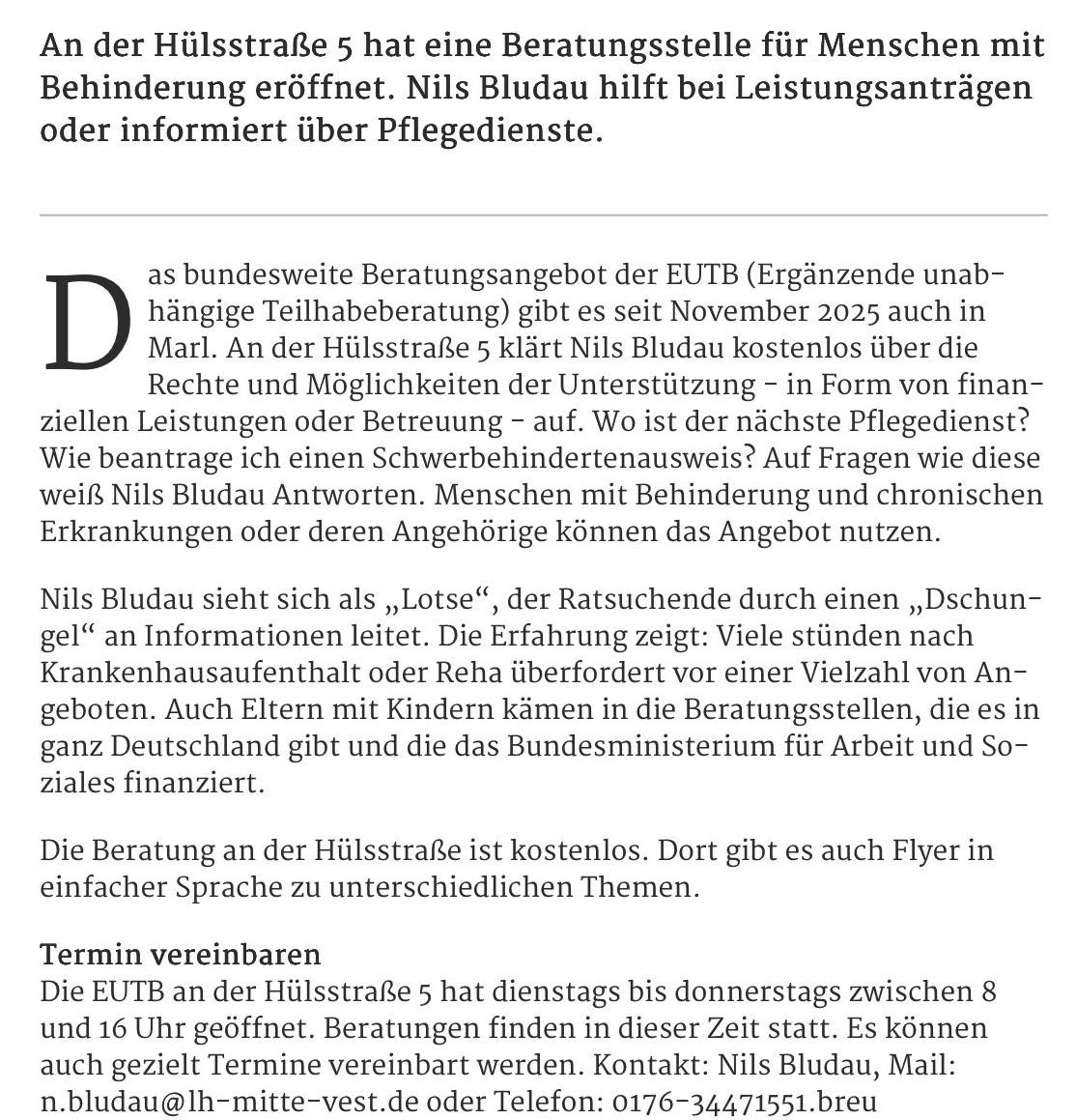 Die ergänzende unabhängige Teilhabeberatung (EUTB) bietet in der Hülsstr. 5 immer dienstags bis donnerstags von 8 - 16 Uhr ein kostenloses Angebot in Form von Beratung, Aufklärung und Hilfe zur Antragstellung.